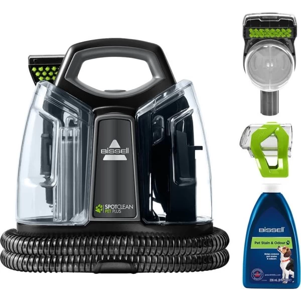 Tag kampen op med uventede pletter og vedvarende lugte med BISSELL SpotClean Pet Plus. Fjern effektivt stænk og pletter, uanset hvor du finder dem, ved hjælp af vand, BISSELL rengøringsopløsning og specialiserede rengøringsmundstykker med kraftig sugning.