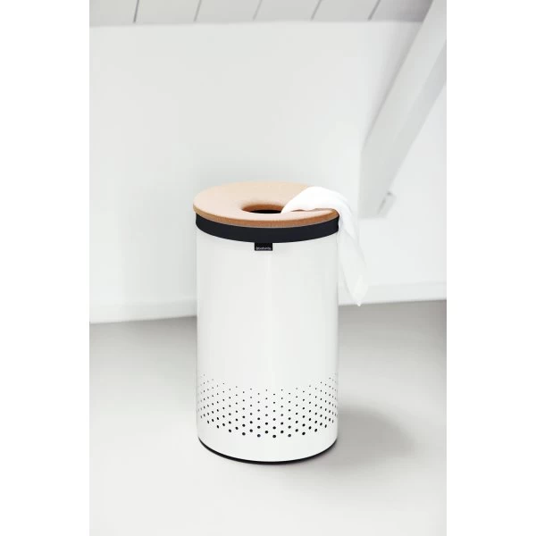 Låget er fremstillet af kork og giver et skandinavisk look med varme og byder naturen velkommen. Vasketøjskurvens flytbare inderpose, som samtidig er vaskbar, gør det let at transportere vasketøjet ud til vaskemaskinen.