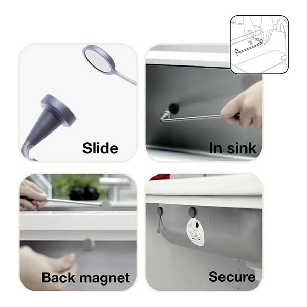 De praktiske modmagneter er designet med en lille ”hale”, så du nemt kan få fat i dem og fastgøre dem. Der medfølger også 2 klistermærker, som du kan klistre på halerne, så modmagneterne ikke flytter sig, når du tager holderen af vasken ved eksempelvis rengøring.