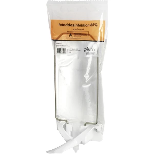 Hånddesinfektionsgelen fra Plum kommer her i en smart dispenserpose til anvendelse i CombiPlum dispensere.