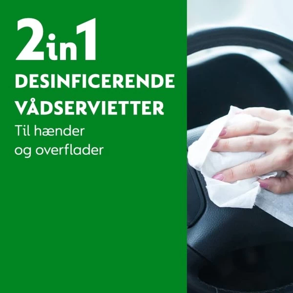 Du kan også med fordel bruge Dettol 2in1 til at rengøre f.eks. håndtag, håndvaske, vandhaner, baderum, toiletter og affaldsspande, som mange er i kontakt med dagligt. Du kan også bruge dem til at holde dit skrivebord og din arbejdsstation ren ved at aftørre bordet, armlænnet på kontorstolen, telefonen og øvrigt skrivebordstilbehør som ofte bliver brugt, så du altid er sikret en ren og frisk arbejdsplads. Du tørrer blot den ønskede overflade af og smider derefter servietten væk – hurtigt og nemt!
