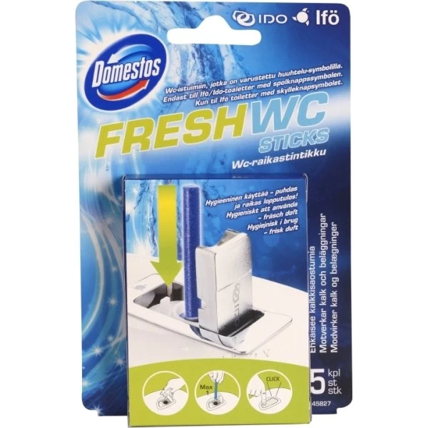 Med Domestos Fresh WC sticks i toilettet har du altid et velduftende toilet. Sticks er en hygiejnisk løsning, hvor toilettet tilføres frisk duft og rengøringsmiddel ved hvert skyl. Fresh Sticks isættes nemt ved skylleknappen, så der ved et tryk frigives rengøringsmiddel og toilettet er velduftende, fri for bakterier og altid nemt at holde pænt og rent.