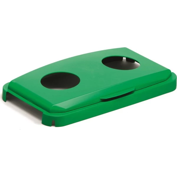 Hængslet låg med åben/lukkefunktion, der passer til 60 liters rektangulære skraldespande fra Durable. Dette låg har to huller til indkast af dåser og flasker. Låget placeres let ovenpå skraldespanden og kan fikseres ved åbning, så spanden nemt betjenes.