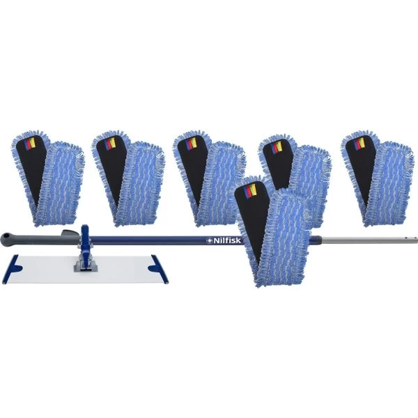 Komplet moppesæt med et blåt S2 skaft, moppehoved/-stativ af aluminium på 40 cm og 6 stk. S-mopper (allround mikrofiber-mopper). Her får du en topprofessionel rengøringsløsning med lang levetid.
