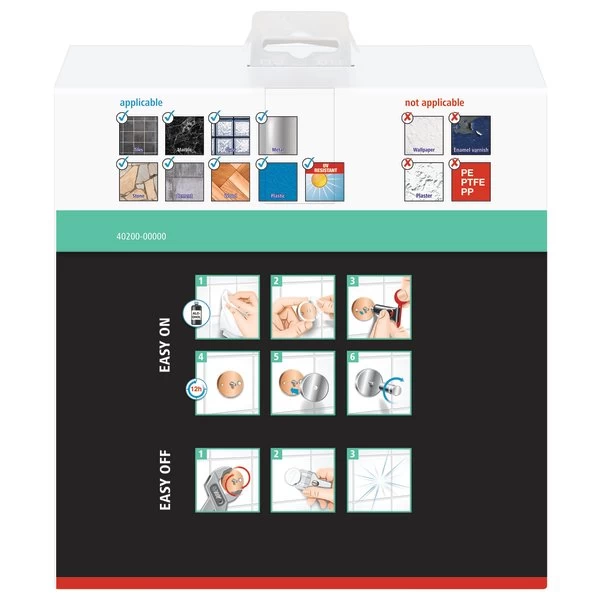 Du vil derudover til enhver tid fjerne kurven og stativet uden af efterlade spor og rester af klæbemidlet – trods det solide ophæng. Med en ny adapter BK43-2, kan du nemt genbruge hjørnekurven og sætte den op igen et andet sted. Gang efter gang.