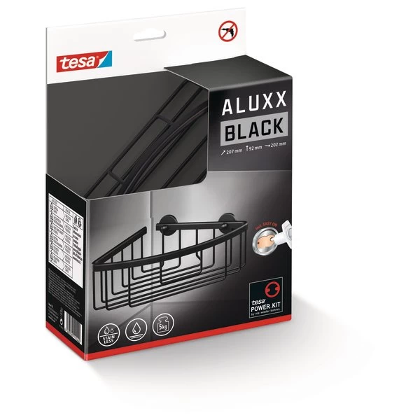 Det er praktisk og bekvemt at have en brusekurv, der hænger klar til opbevaring af dine produkter til badet. tesa® Aluxx selvklæbende hjørnekurv til badeværelse giver et fint blikfang i bruseren. I et minimalistisk og let buede design, er denne en flot og elegant tilføjelse til badeværelset, som kan hænges op overalt. Fremstillet i vandafvisende anodiseret aluminium i tiltagende mat sort farve, passer den perfekt ind i ethvert badeværelsesmiljø.