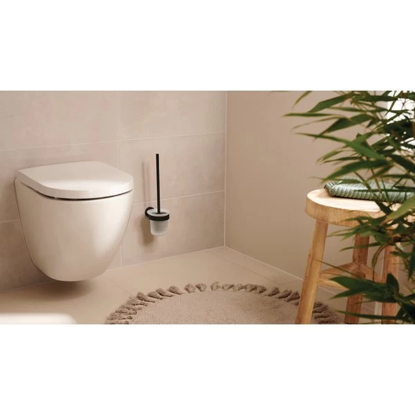 En toiletbørste er et essentielt tilbehør til badeværelset og dette tesa® Moon toiletbørstesæt giver en smuk og tiltalende tilføjelse til indretningen. Sættet er selvklæbende og kan derfor sættes sikkert op helt uden at boremaskinen skal i gang. Fremstillet i lækkert matsort pulverlakeret metal med en holder i satineret glas, passer den elegante og attraktive toiletbørste perfekt ind i ethvert badeværelse.