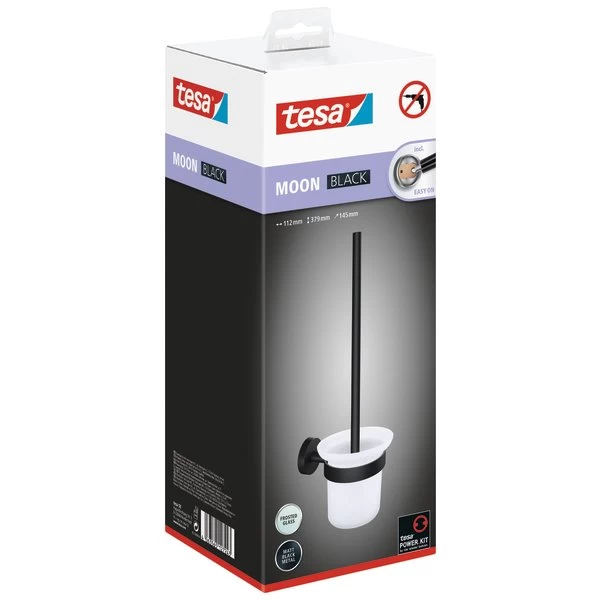 Det er let som en leg at opsætte toiletbørstesættet med tesa® Power.Kit-teknologi. Idet toiletbørsteholderen sættes op med et klæbemiddel, kan den placeres hvor som helst på væggen samt at det ikke nødvendigt at bore, så vægge og fliser forbliver ubeskadigede. Efter klæbemidlet har hærdet i 12 timer, giver toiletbørsten et lige så pålideligt hold, som hvis der var blevet gjort brug af konventionelle metoder.